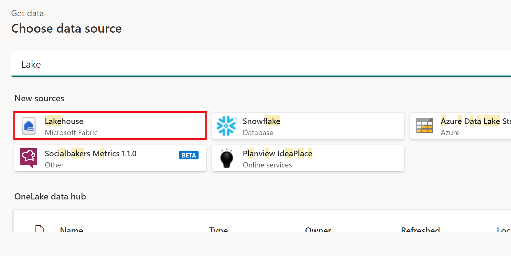 In the OneLake data hub, select the lakehouse you want to connect to. Optionally, you can use the All, My data, or Endorsed in your org buttons to filter the Lakehouses displayed in the dialog. Then select Connect.