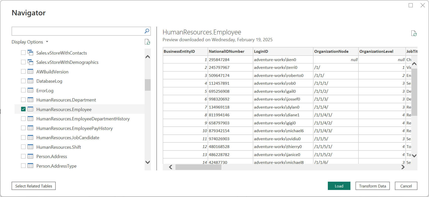 In Navigator, select the database information you want, then either select Load to load the data or Transform Data to continue transforming the data in the Power Query editor.