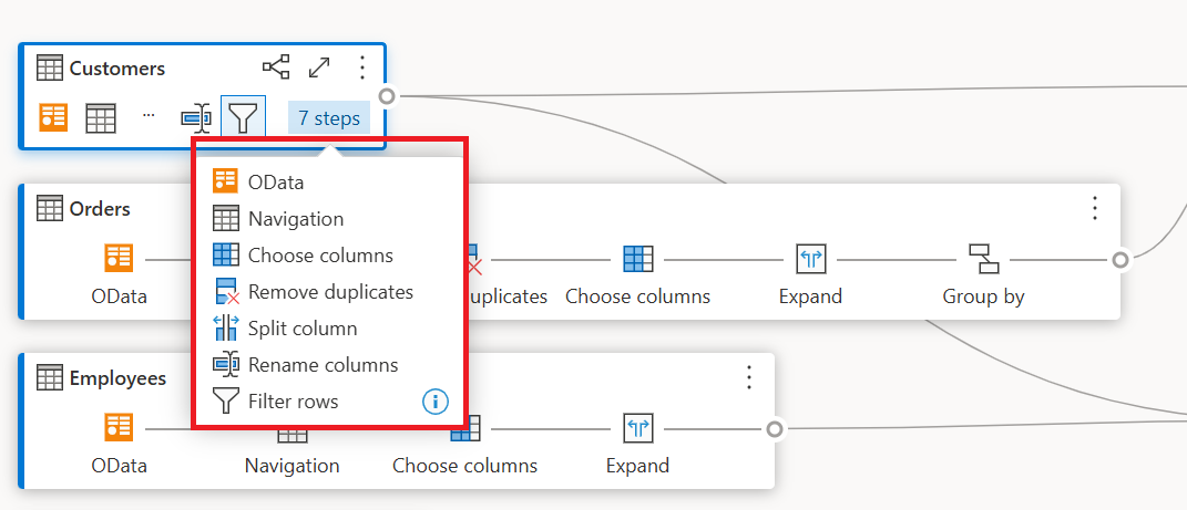 Diagram view offers a visual way to prepare data in the Power Query editor. With this interface, you can easily create queries and visualize the data preparation process. Diagram view simplifies the experience of getting started with data wrangling. It speeds up the data preparation process and helps you quickly understand the dataflow, both the "big picture view" of how queries are related and the "detailed view" of the specific data preparation steps in a query.