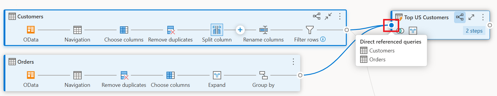 To view all the related queries for a given query, select the Highlight related queries button. For instance, by selecting the highlight related queries button in the Top US Customers query, the Customers and Orders queries are highlighted.
