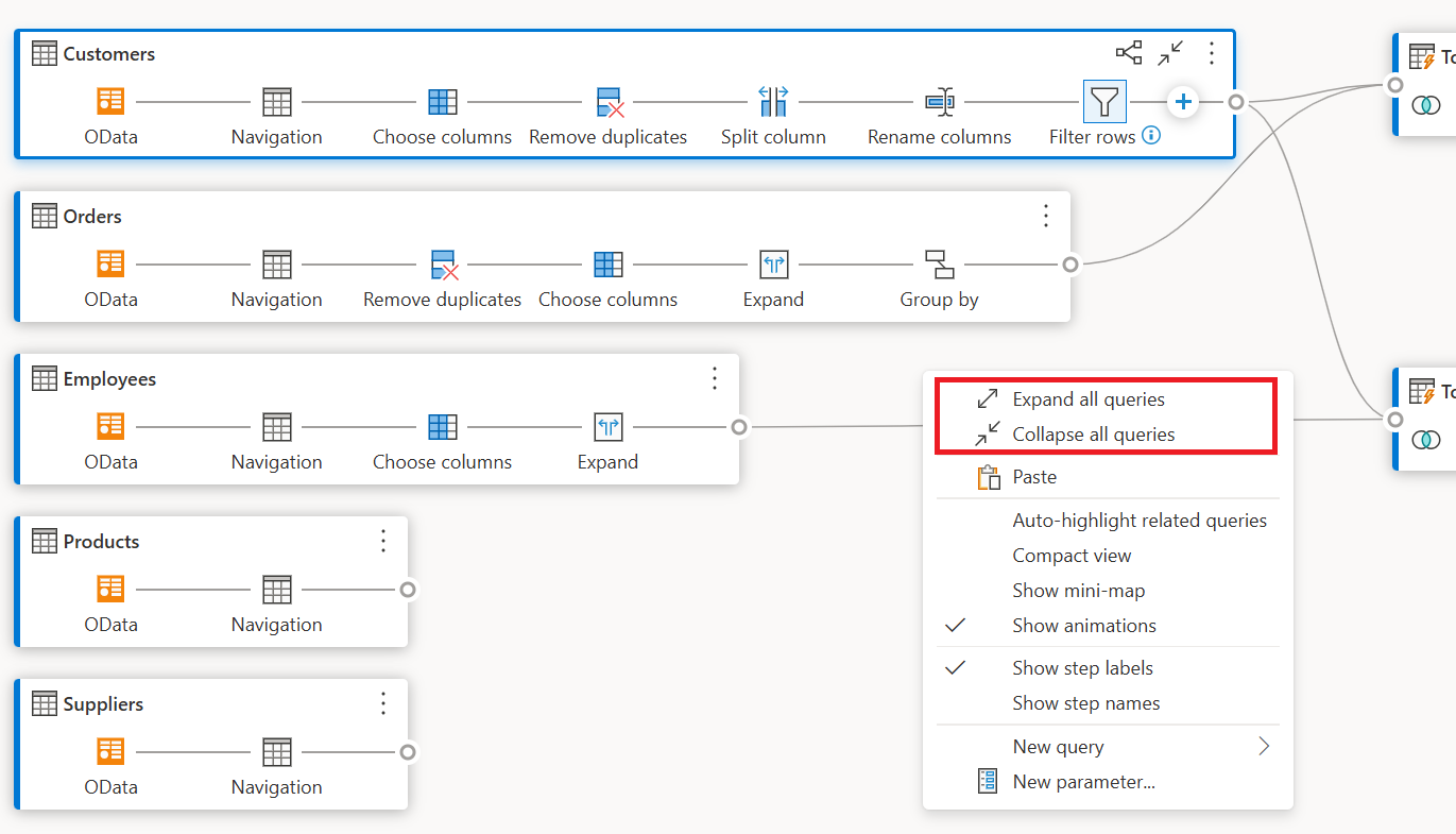 To ensure that you can view your queries in the diagram view, you can collapse the ones that you aren't actively working on and expand the ones that you care about. Expand or collapse queries by selecting the Expand/Collapse button on the top-right of a query. Alternatively, double-clicking an expanded query collapses the query and vice-versa.