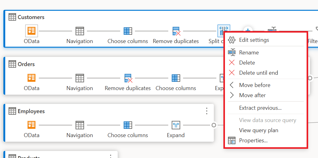 To extract all previous steps into a new query, right-click the first step that you don't want to include in the query, and then select Extract previous.