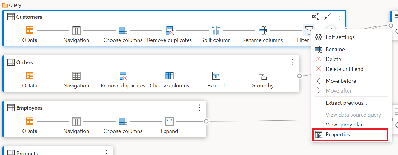 To ensure that the results provided by the query are available for downstream use such as report building, by default Enable load is set to true. In case you need to disable load for a given query, right-click in a query and select Enable load. The queries where Enable load is set to false are displayed with a grey outline.