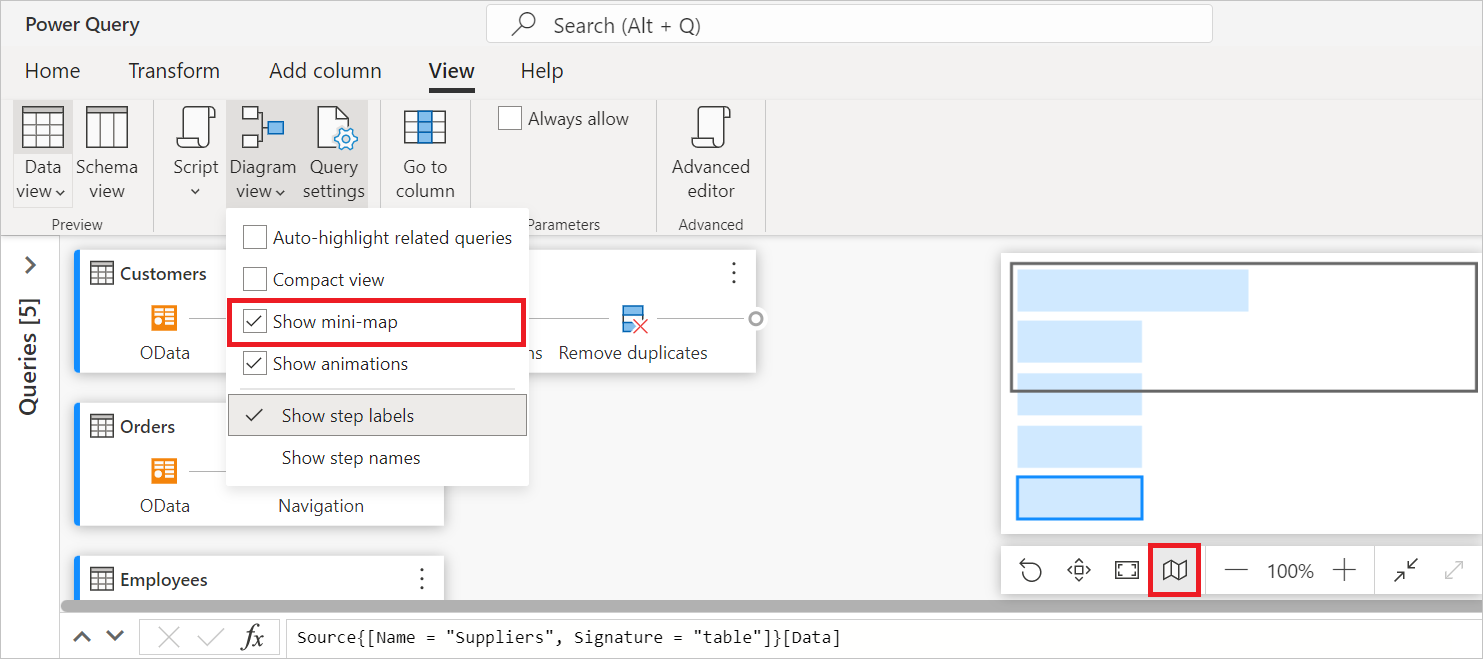 This feature is enabled by selecting Diagram view in the View tab on the ribbon. You can also enable diagram view by selecting the diagram view icon in the lower right side of the Power Query editor. With diagram view enabled, the steps pane and queries pane are collapsed.