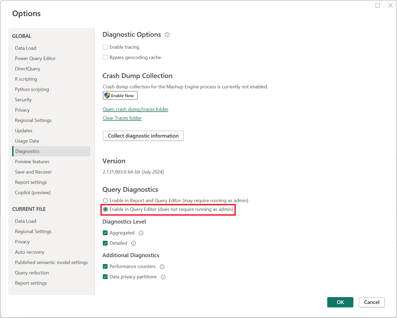 By default, Query Diagnostics might require administrative rights to run (depending on IT policy). If you find yourself unable to run Query Diagnostics, open the Power BI Desktop options page, and in the Diagnostics tab, select Enable in Query Editor (does not require running as admin). This selection constrains you from being able to trace diagnostics when doing a full refresh into Power BI rather than the Power Query editor. But does allow you to still use it when previewing, authoring, and so on.