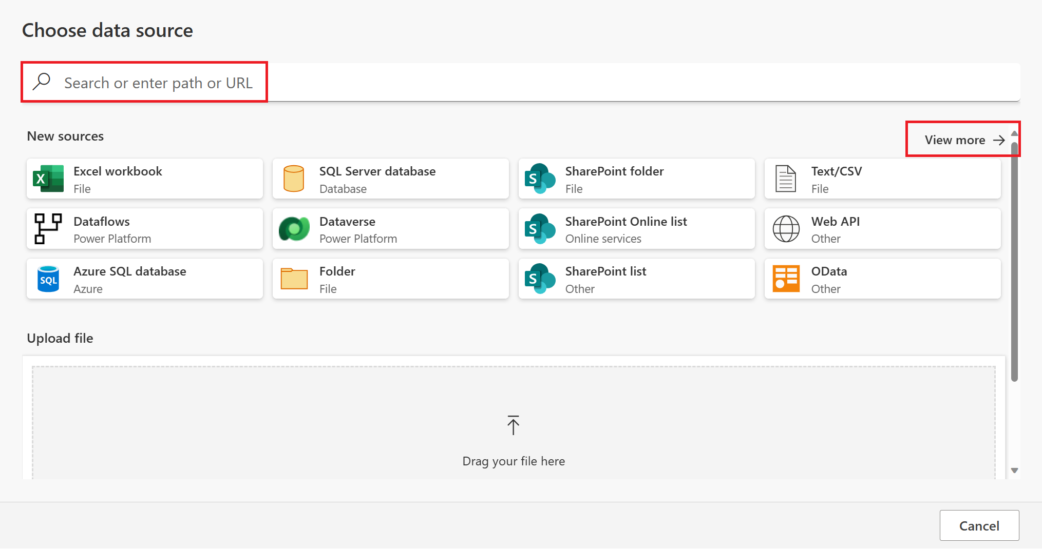 In the Choose data source page, use Search to search for the name of the connector, or select View more on the right hand side the connector to see a list of all the connectors available in Power BI service.