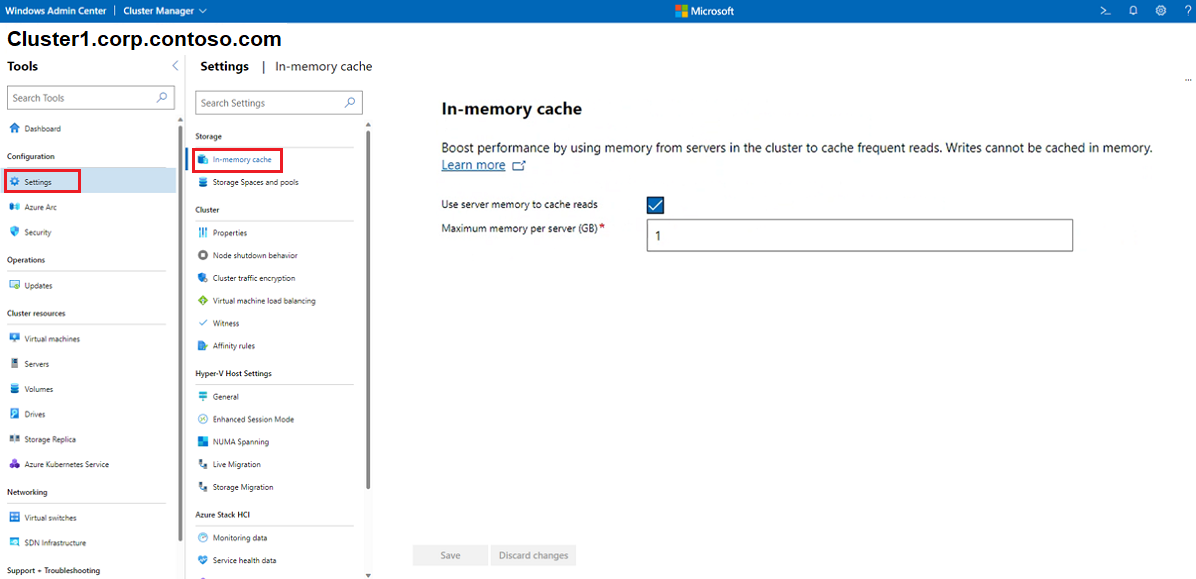 To change your in-memory cache, select In-memory cache and set the memory per server to cache reads. Note, writes can't be cached in memory. For more information, see Understanding the cache in Azure Stack HCI.