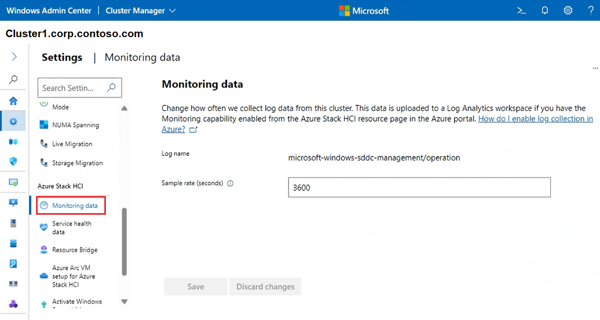 To change how often log data is collected from your cluster, if monitoring capabilities are enabled, select Monitoring data. For information on how to enable log collection, see How do I enable log collection in Azure.