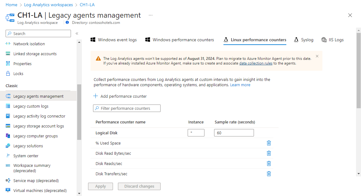 Configure performance counters from the Legacy agents management menu for the Log Analytics workspace.