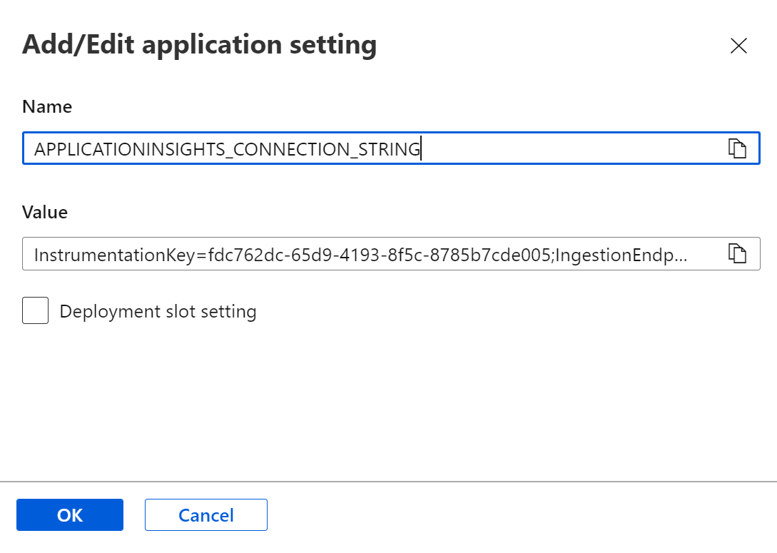 Value Paste the Application Insights connection string value you copied in the preceding section.