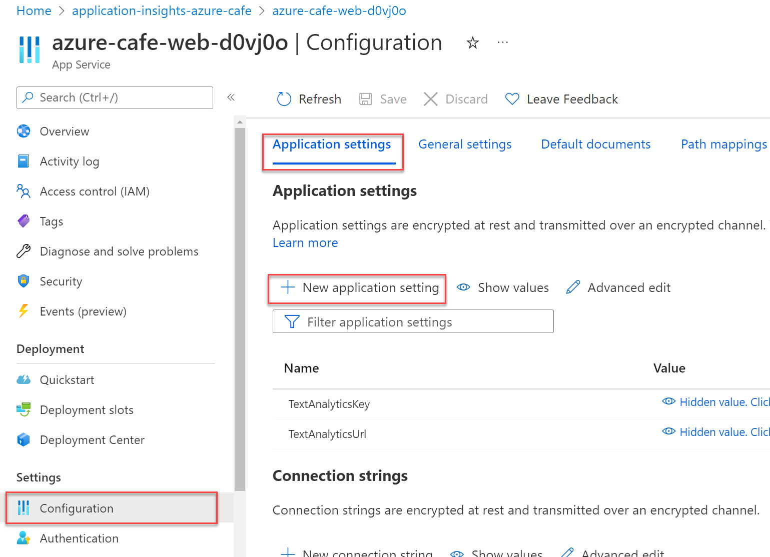 2. From the left menu, under the Settings section, select Configuration. Then, on the Application settings tab, select + New application setting beneath the Application settings header.