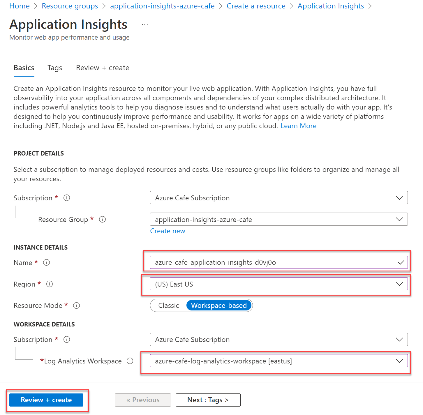 Log Analytics Workspace Select azure-cafe-log-analytics-workspace. Alternatively, you can create a new log analytics workspace.