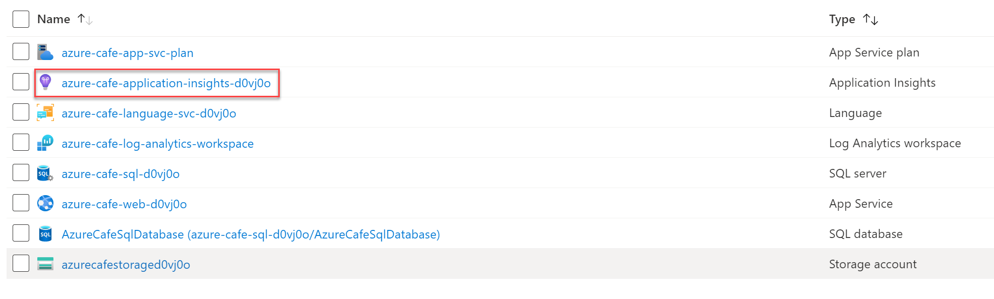3. From the list of resources, select the azure-cafe-insights-{SUFFIX} Application Insights resource.
