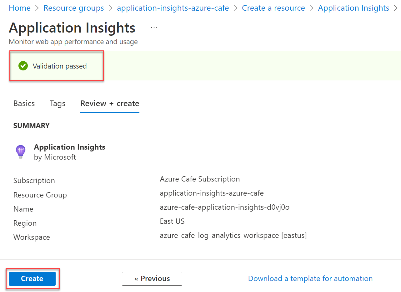 Screenshot of the Application Insights screen in the Azure portal. The message stating validation has passed and Create button are both highlighted.
