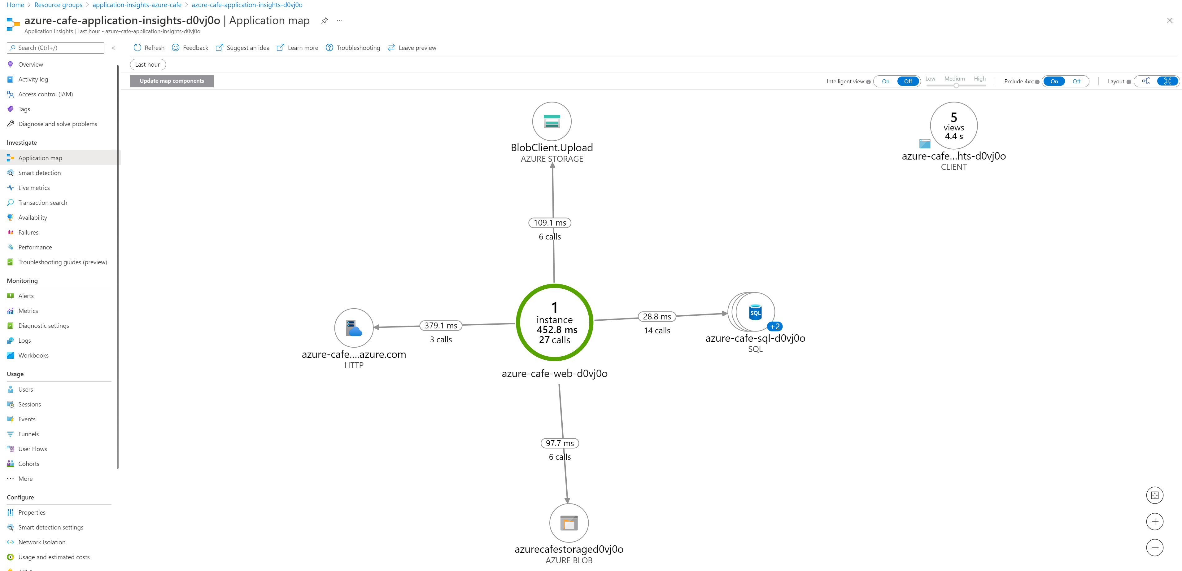 4. From the left menu, beneath the Investigate heading, select Application map. Observe the generated Application map.