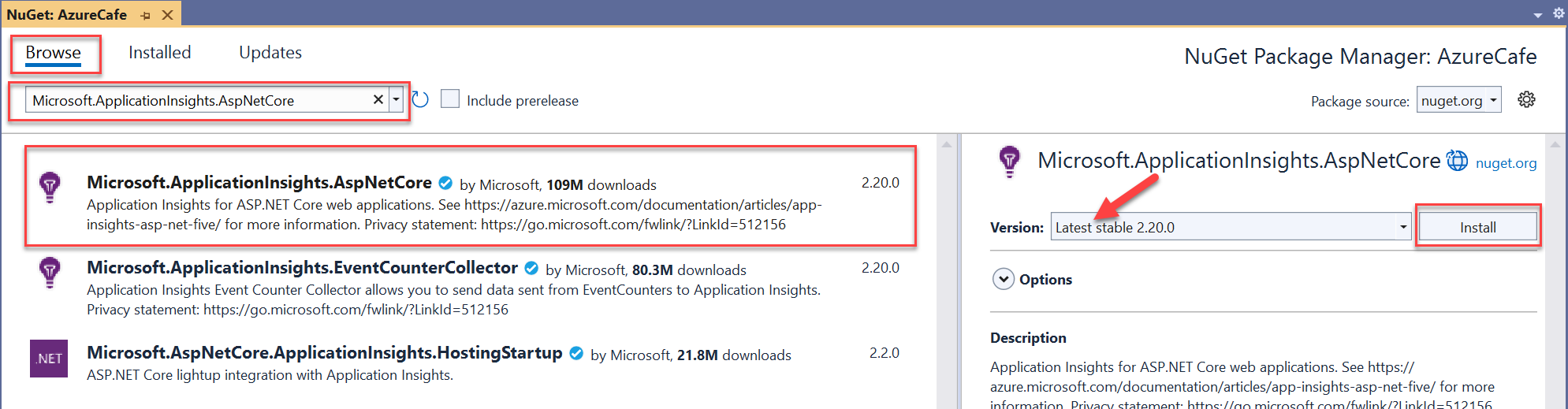3. Select the Browse tab and then search for and select Microsoft.ApplicationInsights.AspNetCore. Select Install, and accept the license terms. It is recommended you use the latest stable version. For the full release notes for the SDK, see the open-source GitHub repo.