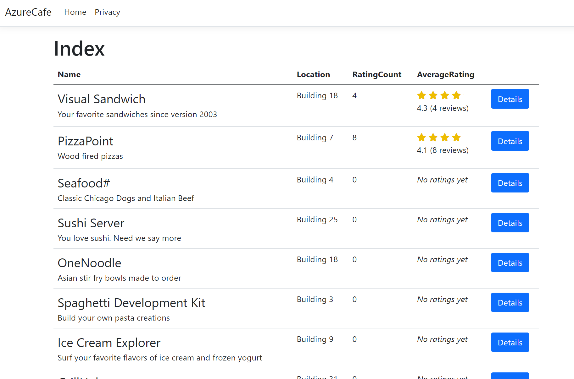 Screenshot of a portion of the Azure Cafe list in the Azure Cafe web application with the Details button highlighted.
