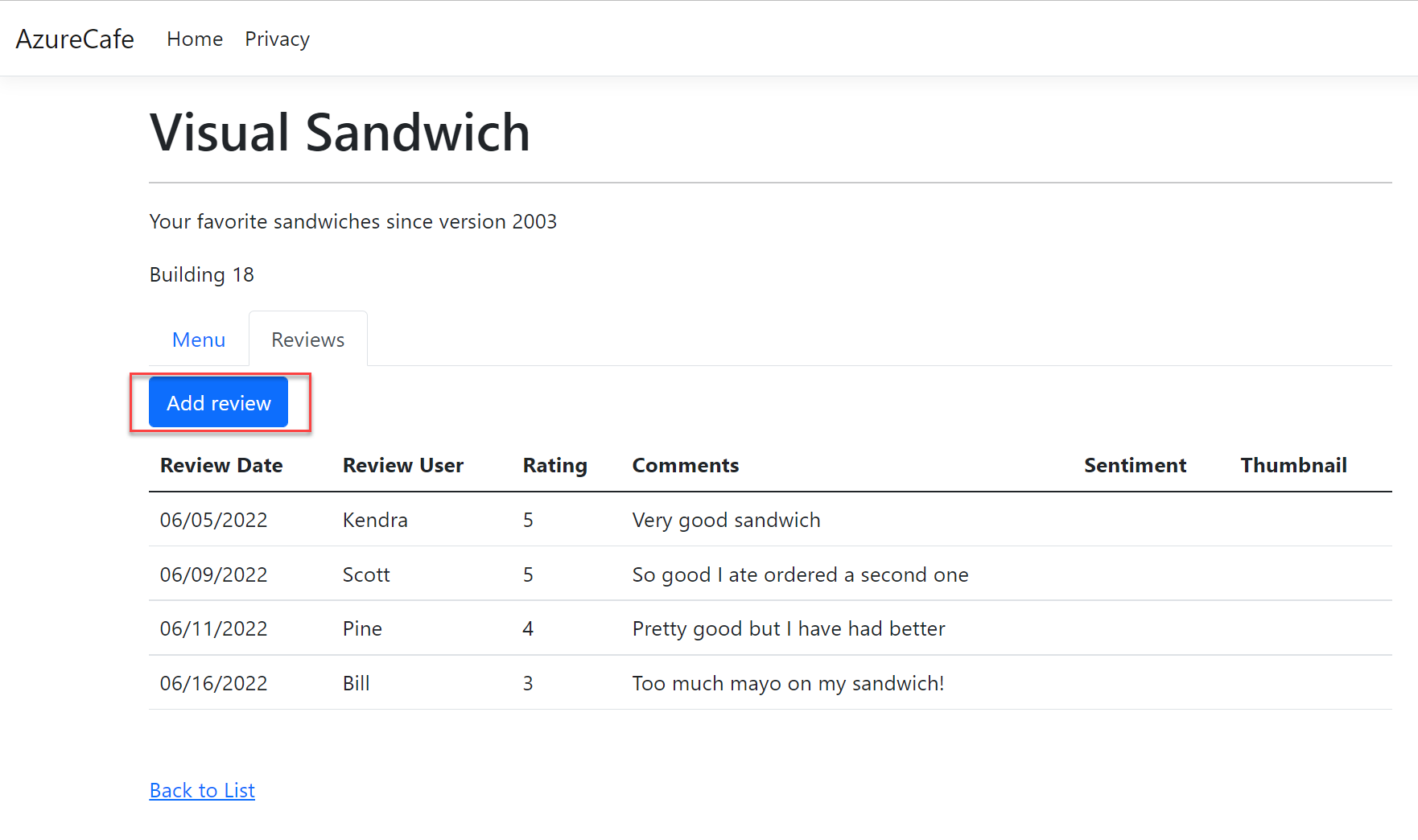 Screenshot of the Cafe details screen in the Azure Cafe web application with the Add review button highlighted.