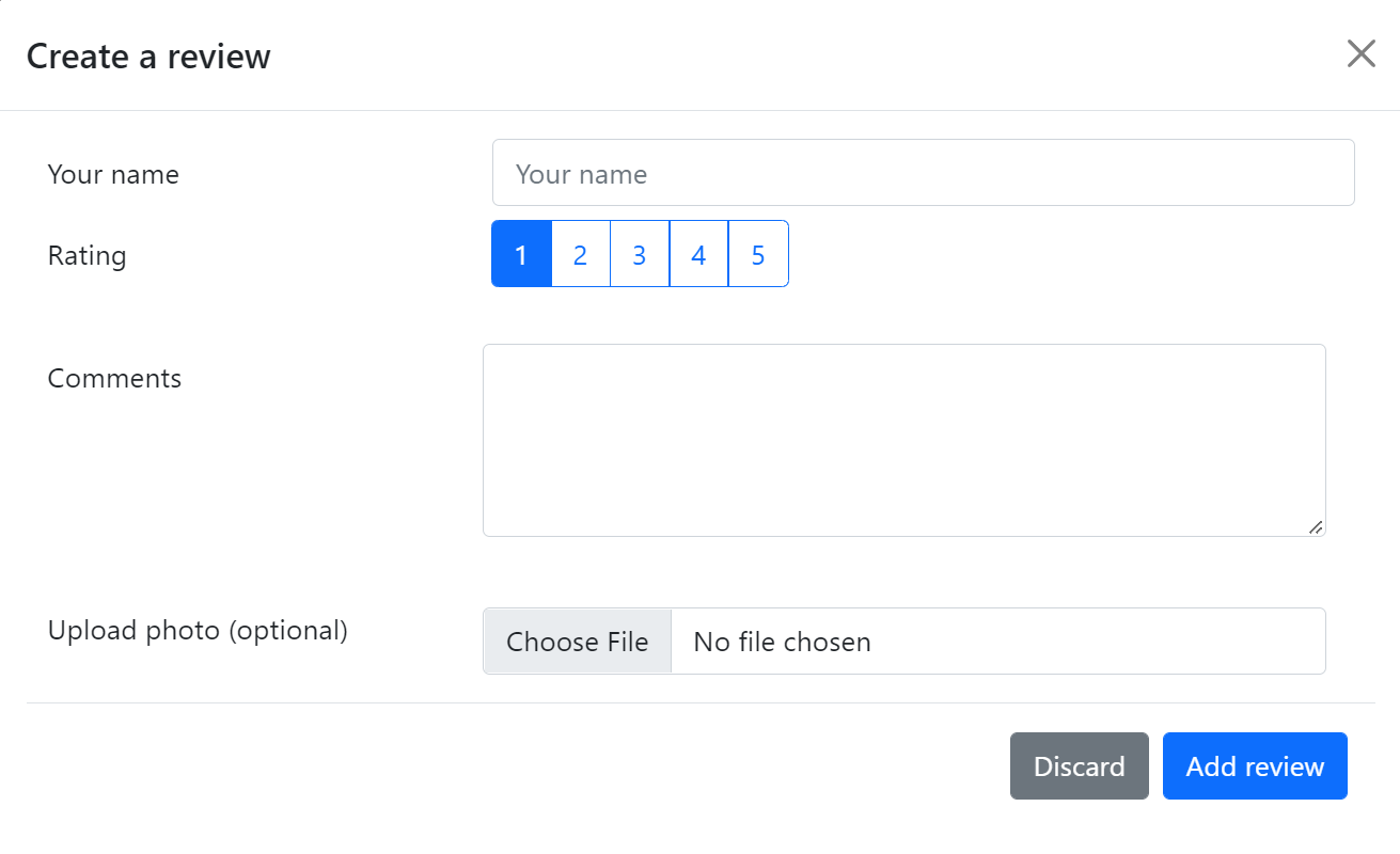 3. On the Create a review dialog, enter a name, rating, comments, and upload a photo for the review. When finished, select Add review.