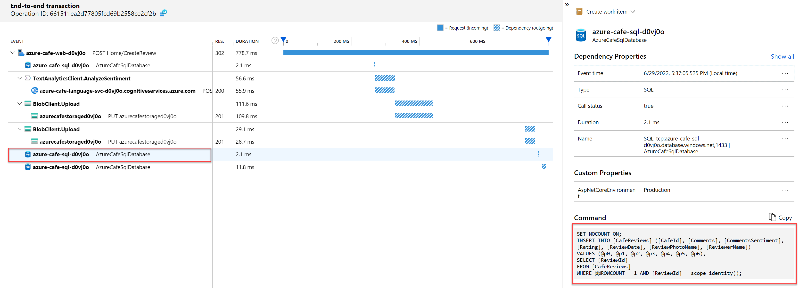 Screenshot of the end-to-end transaction in the Azure portal with SQL command details.