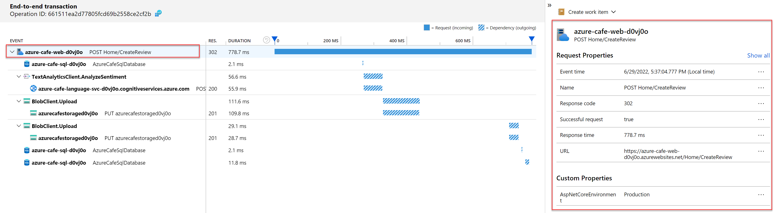 The end-to-end transaction displays for the selected request. In this case, a review was created, including an image, so it includes calls to Azure Storage and the Language Service (for sentiment analysis). It also includes database calls into SQL Azure to persist the review. In this example, the first selected Event displays information relative to the HTTP POST call.
