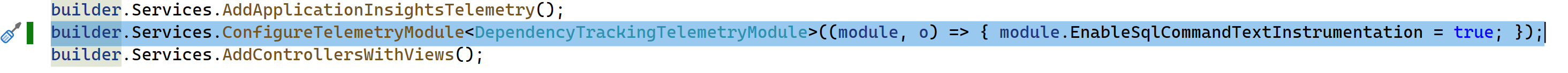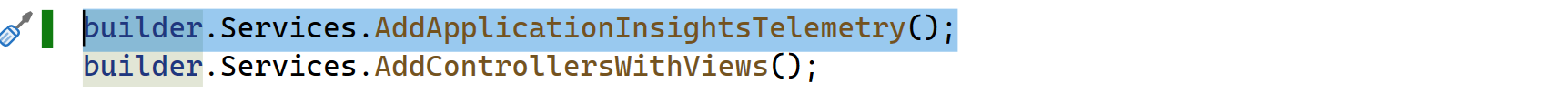 2. Insert the following code prior to the builder.Services.AddControllersWithViews() statement. This code automatically reads the Application Insights connection string value from configuration. The AddApplicationInsightsTelemetry method registers the ApplicationInsightsLoggerProvider with the built-in dependency injection container that will then be used to fulfill ILogger and ILogger<TCategoryName> implementation requests.