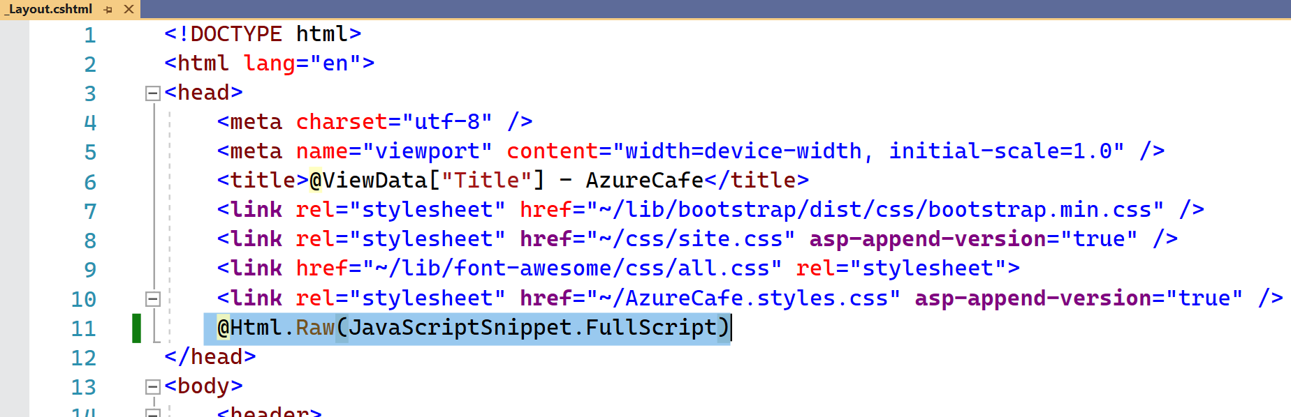 3. To properly enable client-side monitoring for your application, in Visual Studio Solution Explorer, open \Views\Shared\_Layout.cshtml and insert the following code immediately before the closing <\head> tag. This JavaScript snippet must be inserted in the <head> section of each page of your application that you want to monitor.