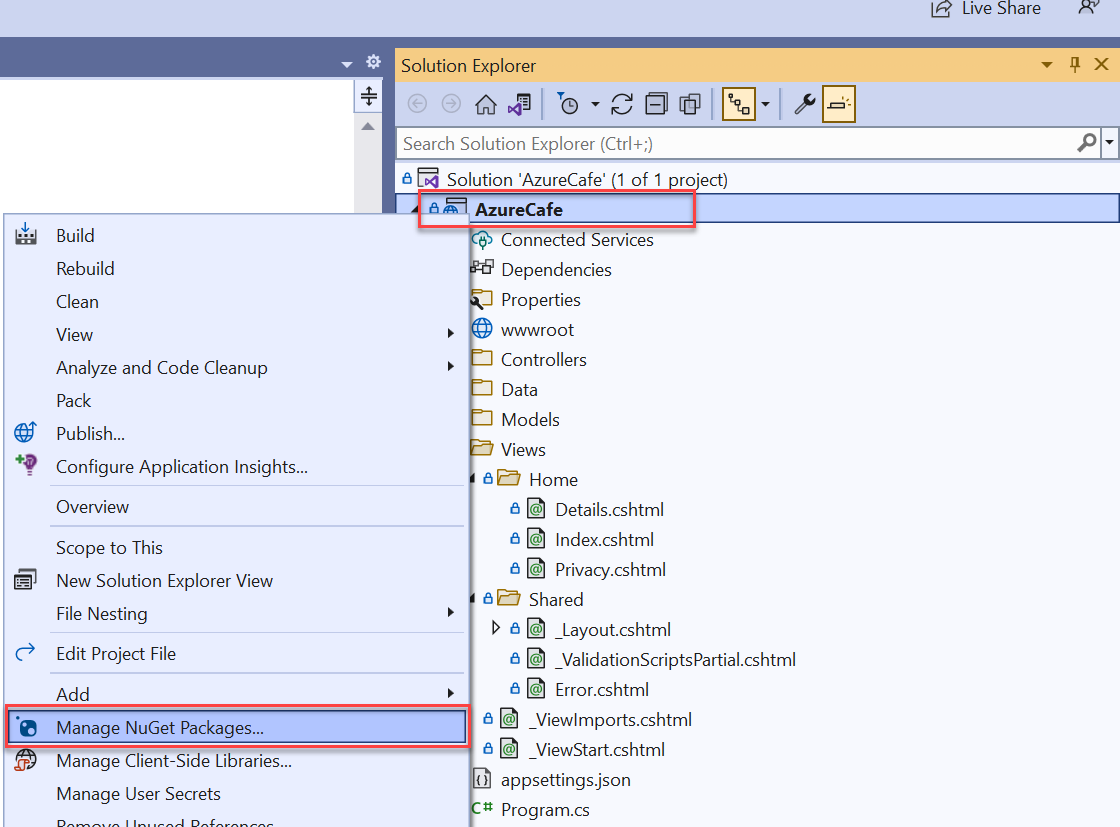 2. In the Visual Studio Solution Explorer panel, right-click on the AzureCafe project file and select Manage NuGet Packages.