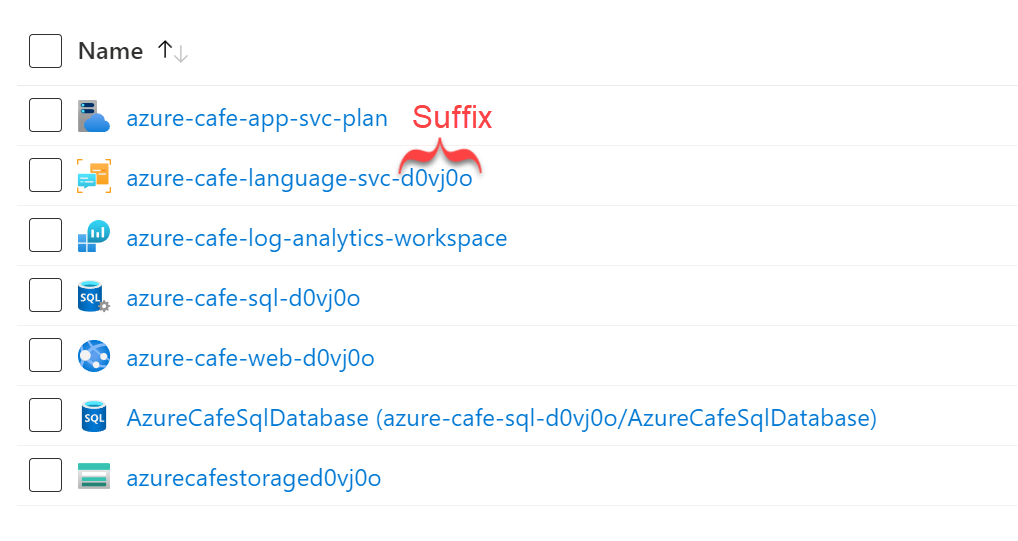 Screenshot of the deployed Azure resource listing in the Azure portal with the six-character suffix highlighted.