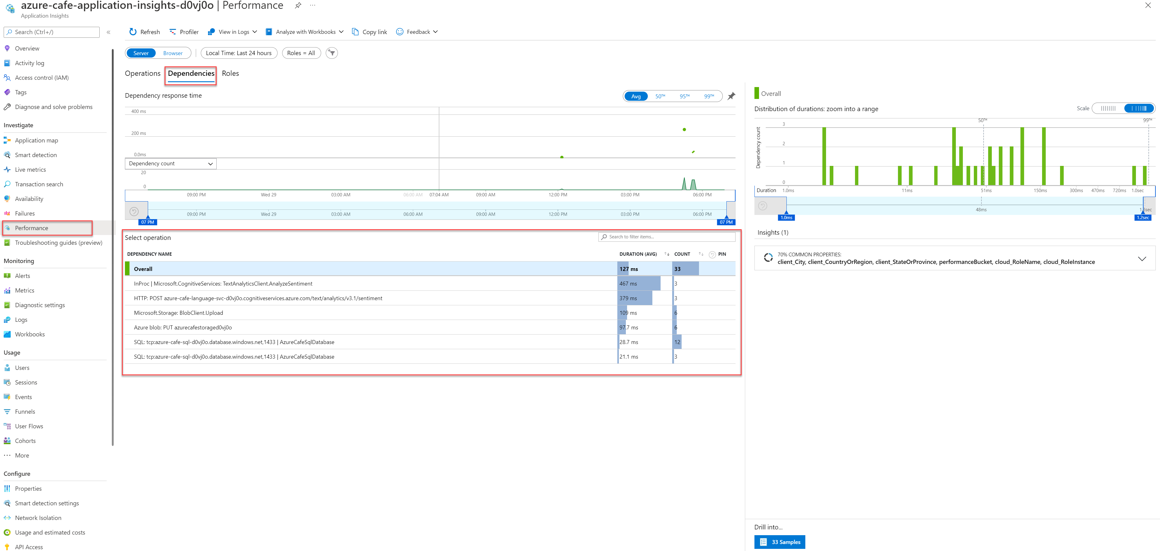 7. Return to the Performance screen and select the Dependencies tab to investigate calls into external resources. Notice the Operations table includes calls into Sentiment Analysis, Blob Storage, and Azure SQL.
