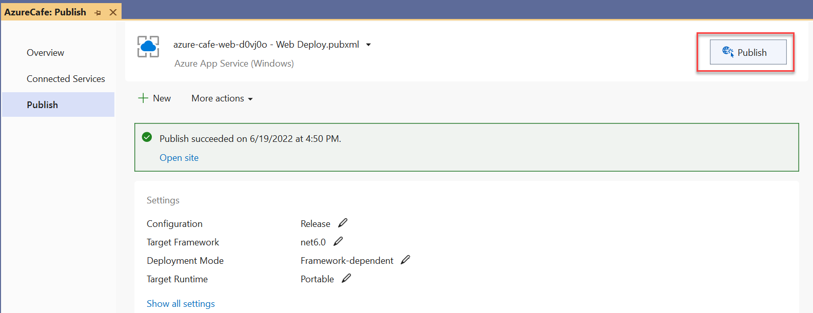 Screenshot of the AzureCafe publish profile with the Publish button highlighted.