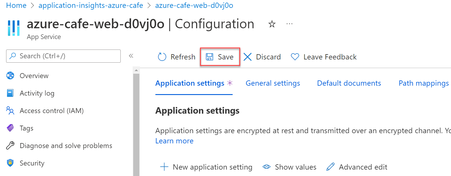 1. Return to the application-insights-azure-cafe resource group and open the azure-cafe-web-{SUFFIX} App Service resource.