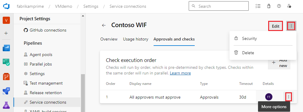 You can also select Security or Delete on the More options menu. For more information about managing security permissions, see Set service connection permissions.