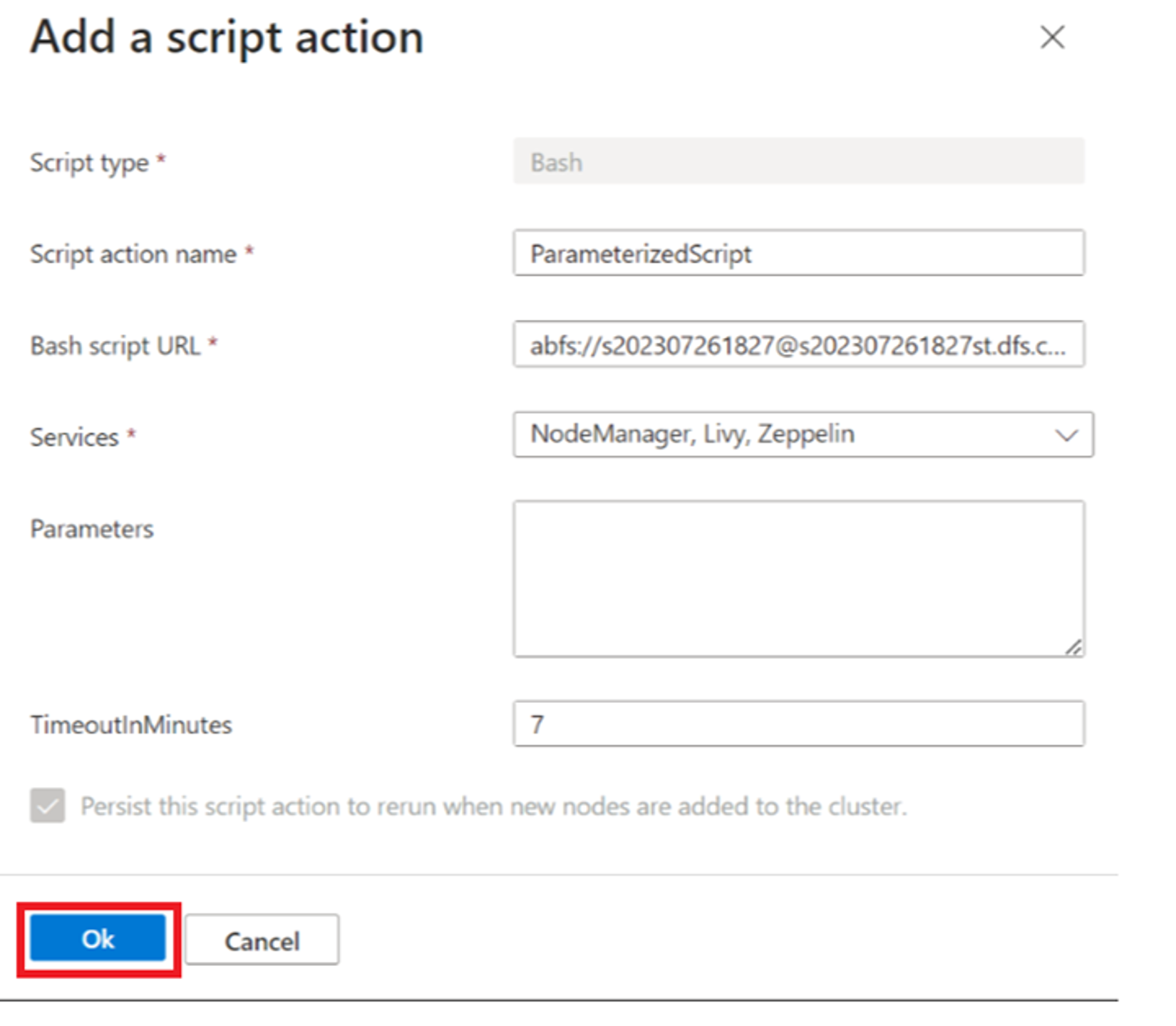 Property Description Script Action Name Unique name of the script action. Bash Script URL Location where the script is stored. For example - abfs://<CONTAINER>@<DATALAKESTOREACCOUNTNAME>.dfs.core.windows.net/<file_path>, update the data lake storage name and file path.Services Select the specific service components where the Script Action needs to run. Parameters Specify the parameters, if necessary for the script. TimeOutInMinutesChoose the timeout for each script Note