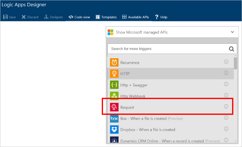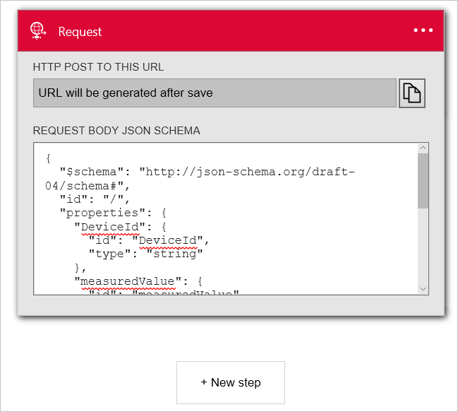 6. Select Request. This action specifies that an incoming HTTP request with a specific JSON formatted payload acts as a trigger.