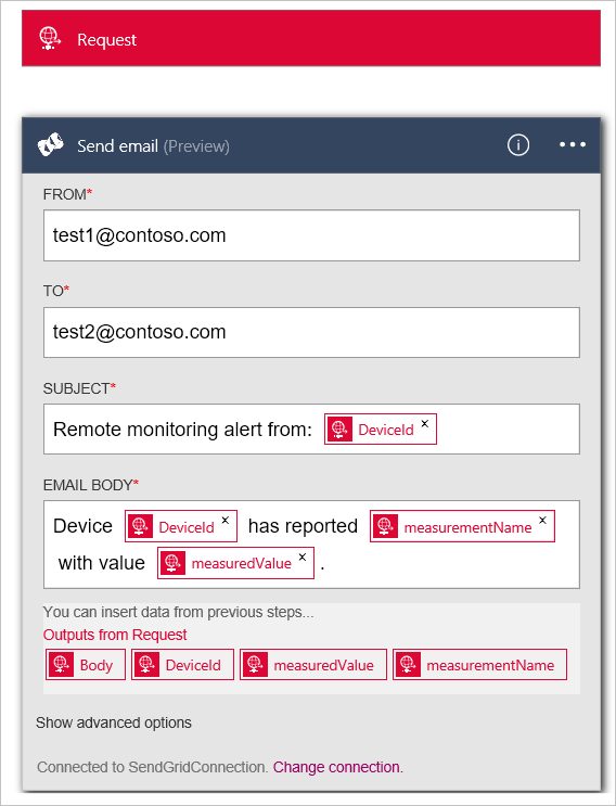 11. Add email addresses you own to both the From and To fields. Add Remote monitoring alert [DeviceId] to the Subject field. In the Email Body field, add Device [DeviceId] has reported [measurementName] with value [measuredValue]. You can add [DeviceId], [measurementName], and [measuredValue] by clicking in the You can insert data from previous steps section.