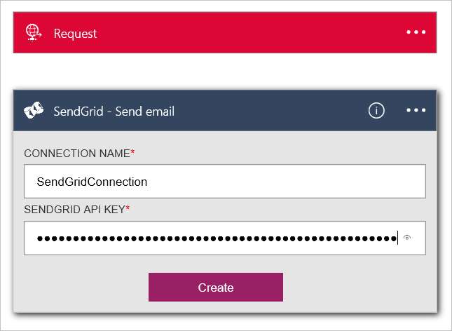 10. Enter a name for the connection, such as SendGridConnection, enter the SendGrid API Key you created when you set up your SendGrid account, and click Create.