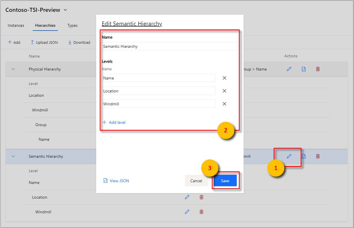 The Azure Time Series Insights explorer supports Hierarchy CREATE, READ, UPDATE, and DELETE operations within the browser.