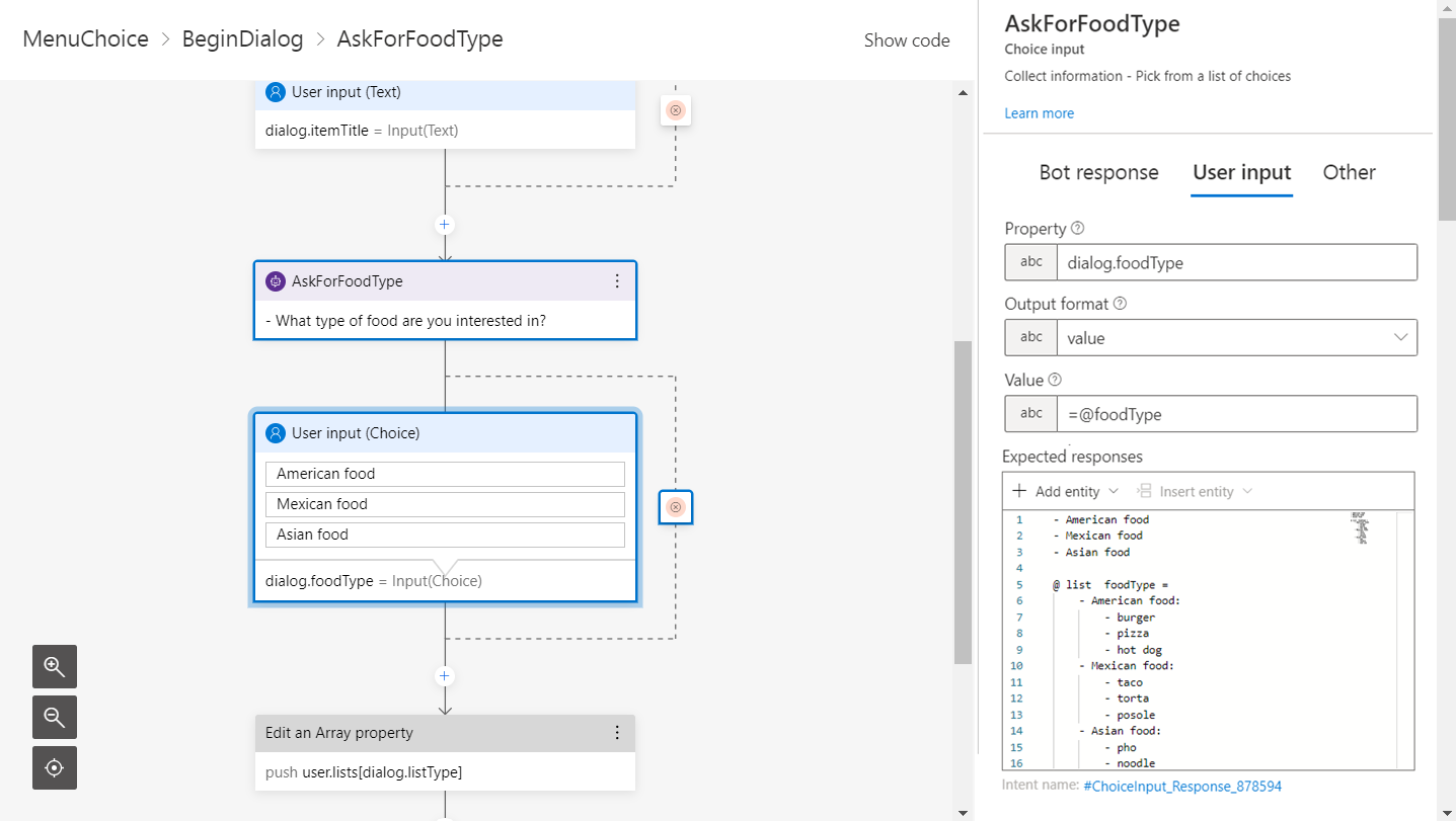Now that you've it loaded in Composer, you can select the additem dialog from the bot explorer. Then, in the BeginDialog trigger select the multi-choice prompt as follows: