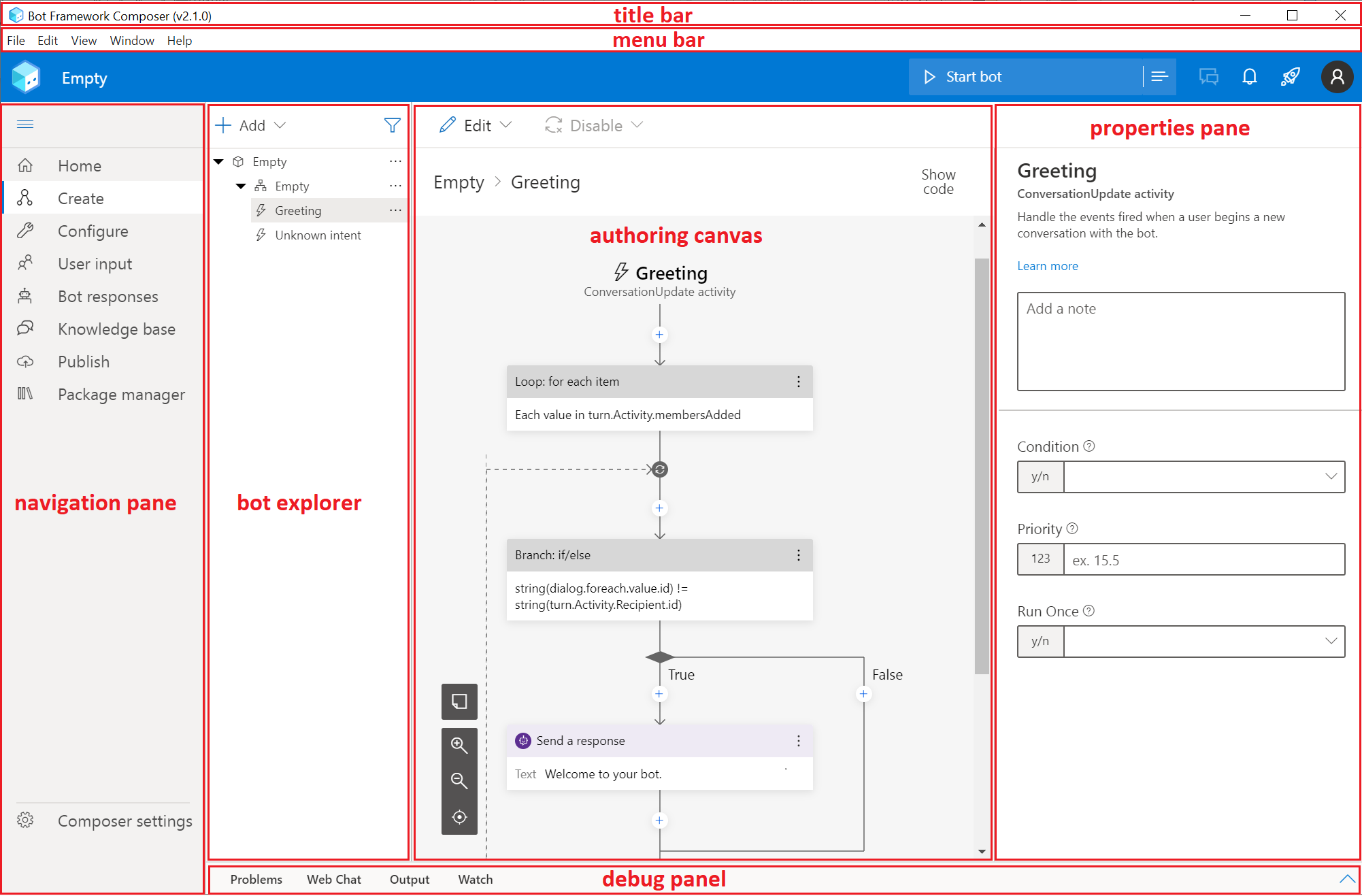 • The authoring canvas: This is where the logic for your bot lives. It shows all actions associated with the selected trigger.