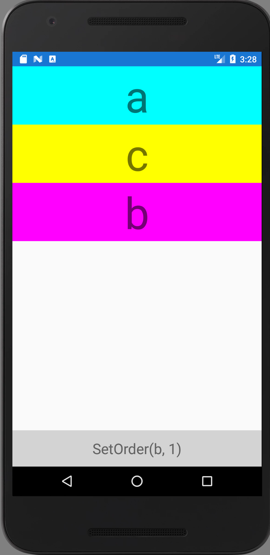 For instance, if 3 children a, b, and c are added in order, and the developer wishes c to appear in the middle, the proper code is FlexLayout.SetOrder(b, 1). (A developer mistaking order priority for an index might wrongly expect FlexLayout.SetOrder(c, 1) to work, but as a and b will still have order priority 0, the elements in that case would still layout in the sequence a, b, c.