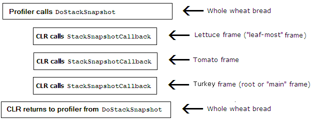 It's like a sandwich. When your profiler wants to walk the stack, you call DoStackSnapshot. Before the CLR returns from that call, it calls your StackSnapshotCallback function several times, once for each managed frame or for each run of unmanaged frames on the stack. Figure 1 shows this sandwich.