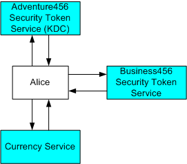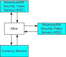 In this approach Adventure456 has issued Alice a Kerberos security token and the Currency service's policy indicates that it only accepts security tokens issued by its own security token service.