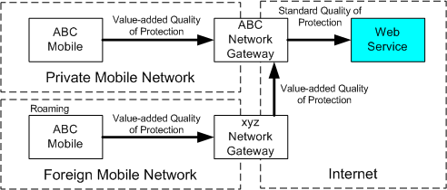 Following is an example combining both these ideas. When a network operator supports mobile clients (using these Web service security specifications) they can configure those clients to send requests via the network operator's gateway. In this scenario the gateway is a SOAP intermediary that actively participates in the overall message flow; specifically, the network operator is providing a value-add encryption algorithm designed for mobile devices. The gateway can augment or change the security tokens and quality of protection of the message. Note that the flexibility inherent in this Web services security model allows this solution even when the device is roaming on a foreign network.