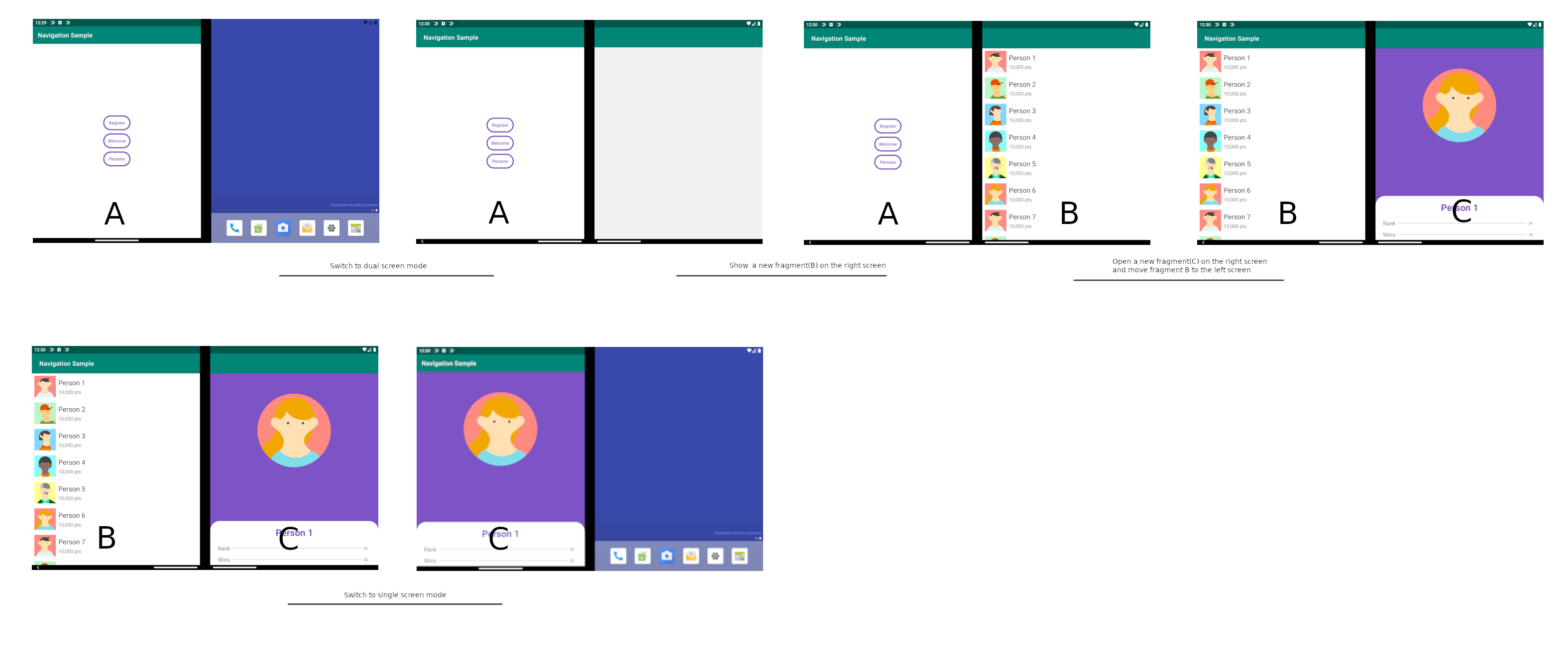 - When the app is moved from being spanned to a single screen, then all fragments from the end screen are moved to the start screen and (C) will appear on top.