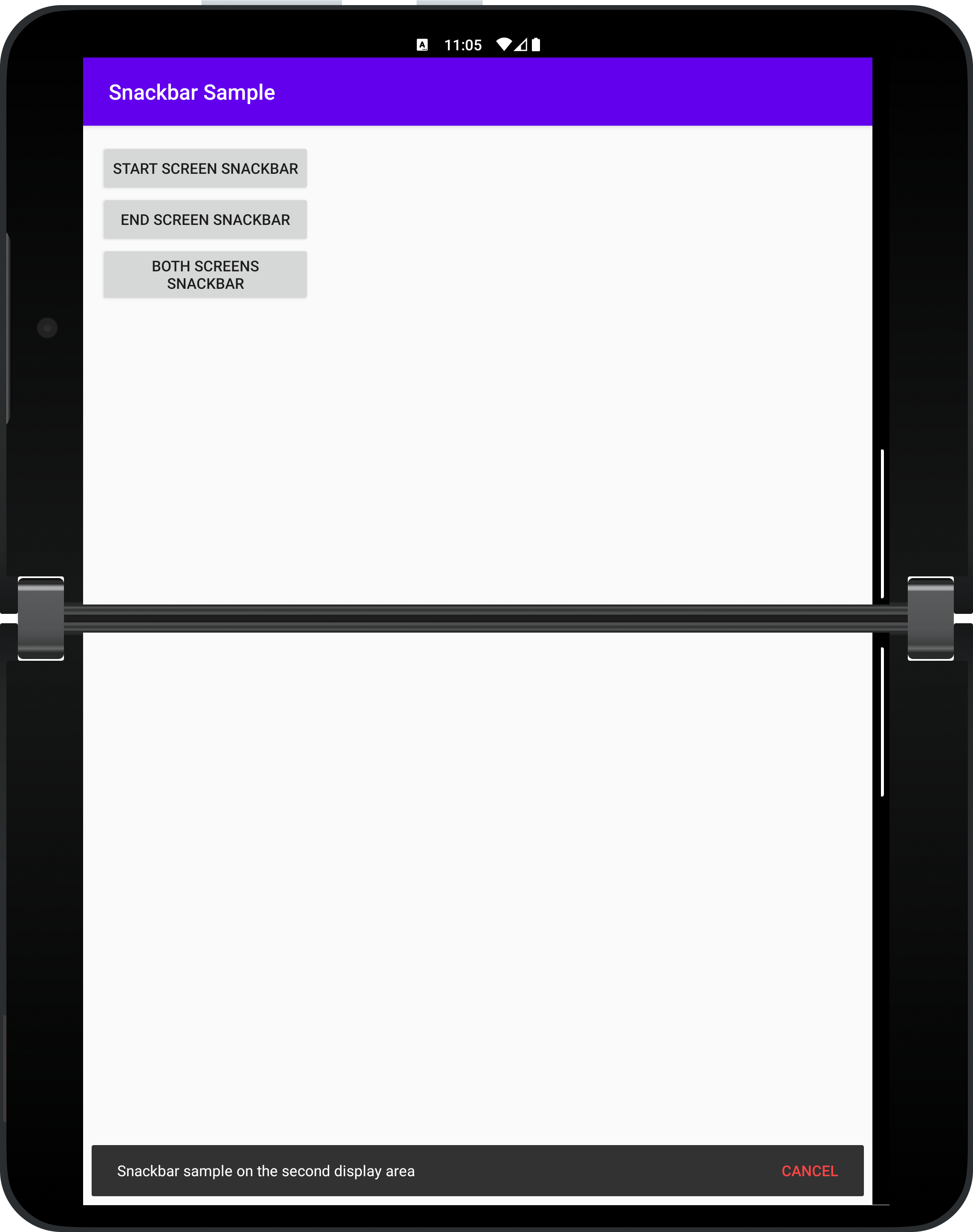 SnackbarContainerat the bottom of theActivityorFragmentroot view:<androidx.constraintlayout.widget.ConstraintLayout xmlns:android="http://schemas.android.com/apk/res/android" xmlns:app="http://schemas.android.com/apk/res-auto" android:layout_width="match_parent" android:layout_height="match_parent" <com.microsoft.device.dualscreen.snackbar.SnackbarContainer android:id="@+id/snackbar_container" android:layout_width="match_parent" android:layout_height="wrap_content" app:layout_constraintBottom_toBottomOf="parent" app:layout_constraintEnd_toEndOf="parent" app:layout_constraintStart_toStartOf="parent" /> </androidx.constraintlayout.widget.ConstraintLayout>Using an instance of the