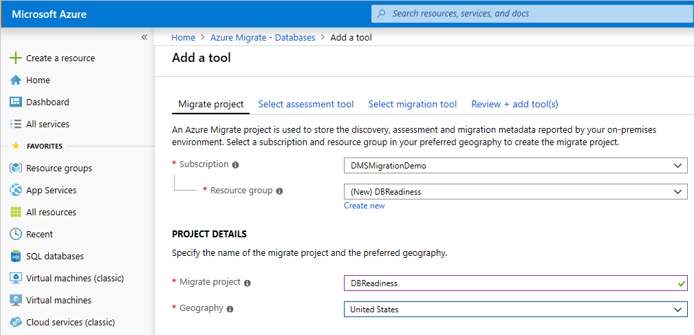 5. On the Migrate project tab, select your Azure subscription and resource group (if you don't already have a resource group, create one).