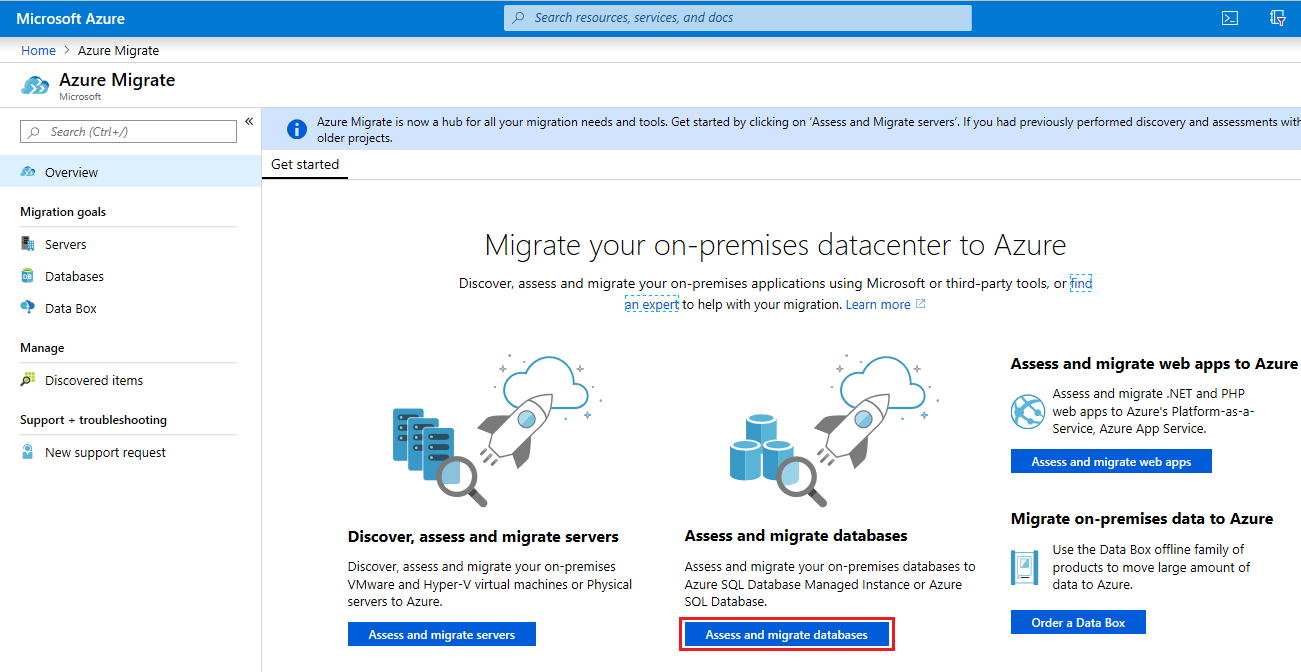 After creating the project, you can select additional tools for assessment and migration of servers and workloads, databases, and web apps.