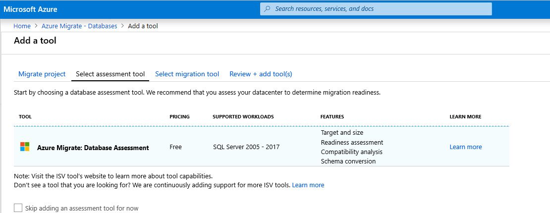 8. On the Select assessment tool tab, Azure Migrate: Database Assessment appears as the assessment tool to add. If you don't currently need an assessment tool, select the Skip adding an assessment tool for now check box. Select Next.