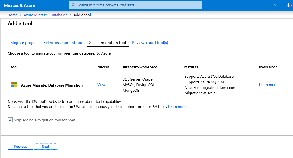 9. On the Select migration tool tab, Azure Migrate: Database Migration appears as the migration tool to add. If you don't currently need a migration tool, select the Skip adding a migration tool for now. Select Next.